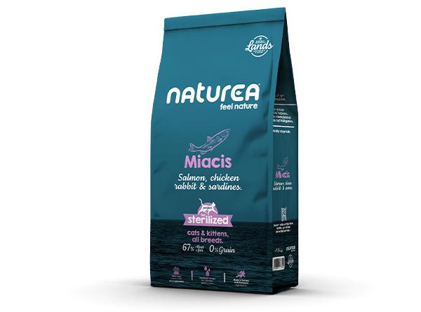 Naturea Miacis fue creada por veterinarios y nutricionistas siguiendo el concepto Naturally Suited y es apta para alimentar a todo tipo de gatos de todas las edades. Sin cereales, baja en carbohidratos y elaborada con ingredientes aprobados para el consumo humano, Naturea Miacis contiene un 67 % de ingredientes de origen animal, concretamente salmón, pollo, conejo y sardinas.