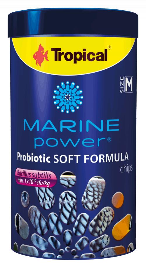 Alimento blando en forma de chips que se hunden con probiótico Bacillus subtilis para peces marinos omnívoros. El probiótico añadido al alimento contiene endosporas bacterianas viables que estabilizan la microflora intestinal, potenciando la resistencia de los peces a los patógenos y facilitando la utilización de nutrientes, lo que a su vez reduce la contaminación del agua con heces. El probiótico aumenta la resistencia de los peces al estrés. El alimento contiene arenque e insectos que aportan proteínas de alta calidad y ácidos grasos Omega-3, Omega-6 y Omega-9. También contiene crustáceos y moluscos (krill 10,5 %, calamar 6 %, calanus 1,7 %) y algas (Spirulina platensis 12 %, Chlorella vulgaris 8 %, Ascophyllum nodosum 3 %, Laminaria digitata 1,8 %), que aportan proteínas, carotenoides, minerales y prebióticos. Intensifica la coloración de los peces gracias a su alto contenido en carotenoides. krill, calanus y pimiento rojo