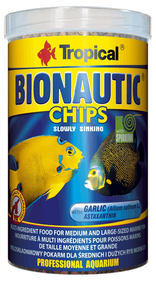 BIONAUTIC CHIPS es un completo alimento multi-ingrediente para peces marinos medianos y grandes, crustáceos e invertebrados. Elaborado principalmente con materiales crudos de origen marino. Contiene ajo, spirulina y astaxantín.